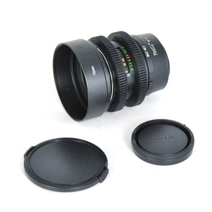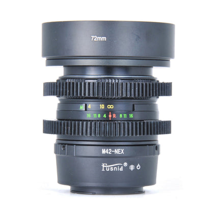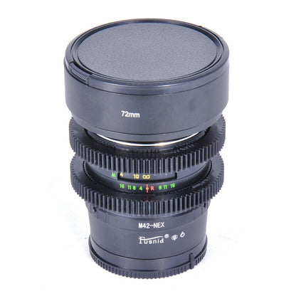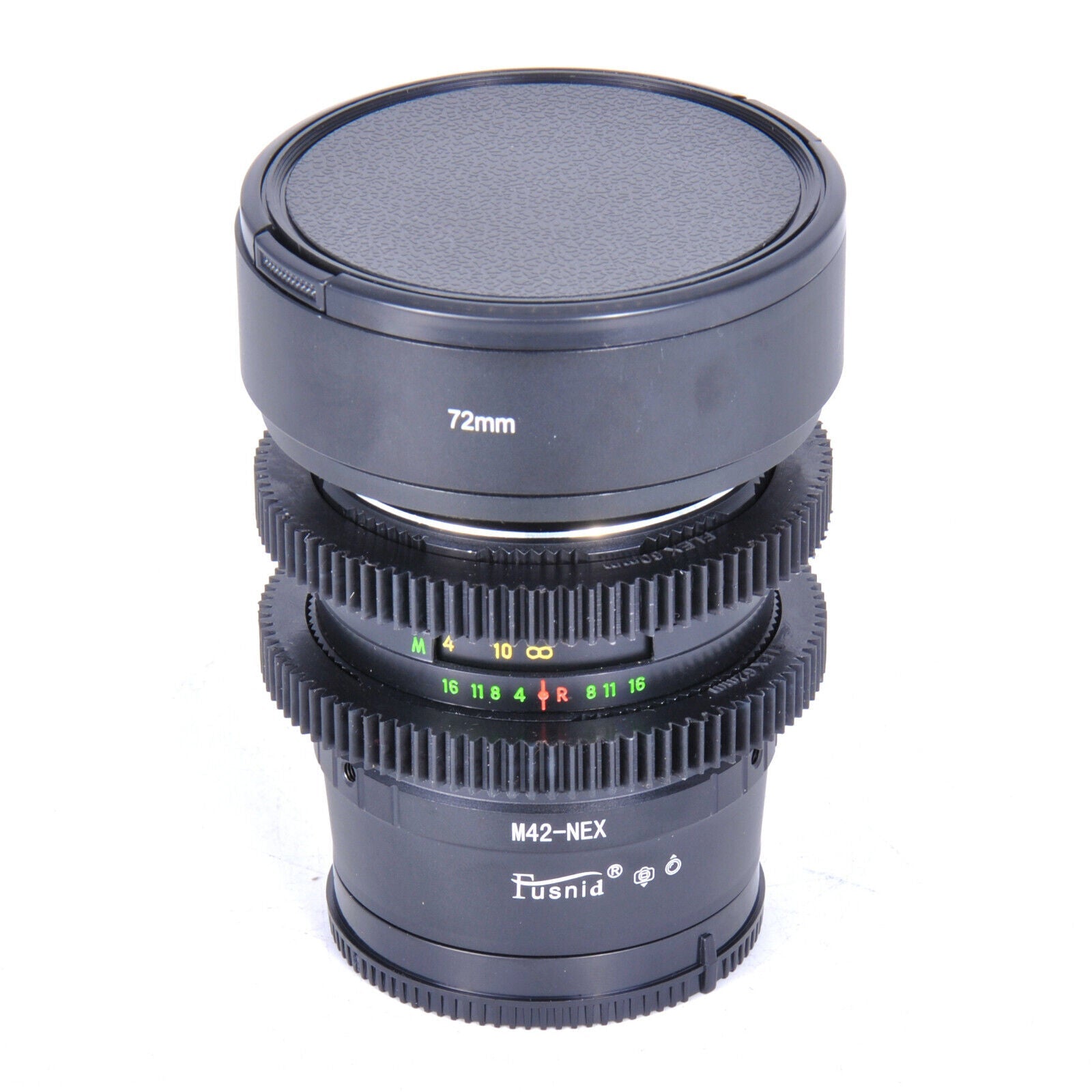 Lens is in good condition, compatible with all M42 Screwmount cameras. You can use it with any digital or film cameras with adapters from M42 Screwmount to your mount. This offer includes adapter & rear cap for Sony E-mount, which allow you to use the lens on Sony cameras directly after purchase. Focus and aperture rings move freely, without resistance, aperture was de-clicked. Glass is in good condition, free of fungus, but may have very minor cleaning marks, which will not affect the image quality. Lens was cleaned, adjusted and re-lubricated. This offer includes lens, front and rear caps, 80mm cine lens hood (with 77mm filter thread), 2x 0.8 follow focus gears and great quality lens adapter for Sony E-mount.